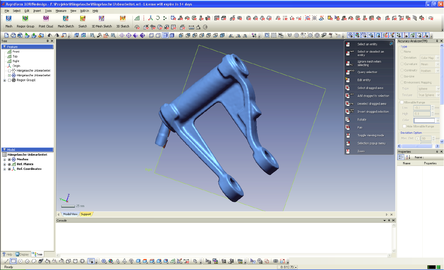 Dieser Sensor arbeitet nach dem Prinzip der Lasertriangulation. D.h. der Scanner erfasst die Profillinien, die das planar aufgefächerte Licht eines Festkörperlasers auf den Oberflächenmerkmalen des Messobjekts bildet. Der Bediener steuert die Datenerfassung ganz einfach über Tasten am Messarm. Die einzelnen Profillinien werden anhand der zugehörigen Messarmposition in ein gemeinsames Koordinatensystem übertragen. Durch Kombination dieser Profillinien entsteht schließlich ein 3D-Bild der Bauteil-Topologie.